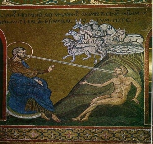 Our Fathers in the Faith handed down to us the traditional icon of the creation of St. Adam shown below. It powerfully refutes the diabolical myth of human evolution from lower life-forms by making present the reality that the “first Adam” was immediately created body and soul in the perfect image and likeness of the “last Adam,” Our Lord Jesus Christ. However, no doubt because of the widespread influence of Gnosticism and Neo-Platonism in the patristic era, the founders of the iconographic tradition were not inspired to show St. Adam in the glory that he actually possessed, radiating the light of God as Our Lord Jesus Christ Himself did on Mt. Tabor at His Holy Transfiguration. In an atmosphere permeated with the ideas of Gnostics and Neo-Platonists who denigrated the material creation and even the human body, a portrayal of St. Adam in his state of Original Holiness might have misled the faithful into thinking that St. Adam and St. Eve were not fully human creatures, possessed of a human body and soul, living one life with God in their humanity.